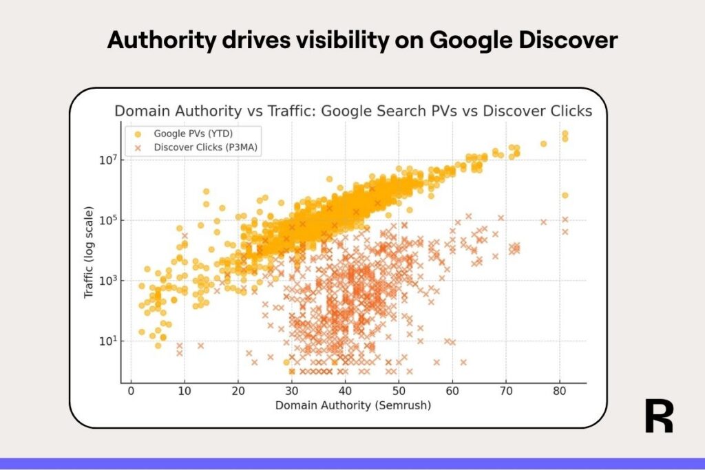 It’s harder to break into Discover than search. Domain Authority (DA) and branded search volume both correlate very strongly with Discover and search, but in different ways.