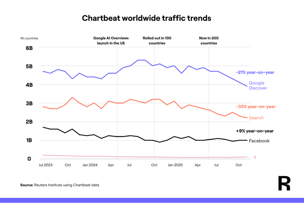 In the first half of 2025, industry reports showed that while search was declining under threat from AI Overviews, Discover traffic continued to grow. That changed in the second half of the year, when Discover started to decline as well.