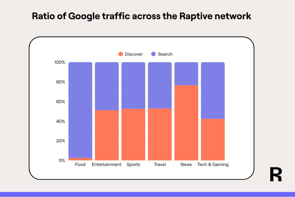 Across the Raptive network, some verticals tend to get much more Discover traffic than others. For tech, gaming, sports, and travel verticals, roughly 50% of Google traffic comes from Discover. For news, it’s 76% and for food, that number plummets to 2%.
